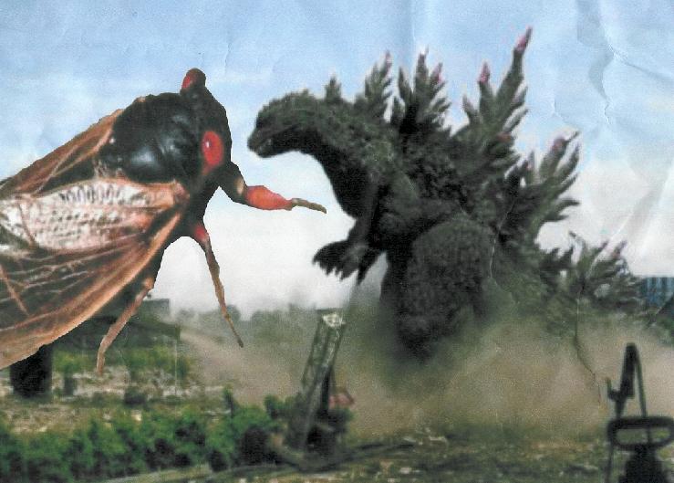 It's not quite as absurd as it looks if you keep in mind that the total mass of all the recent cicadas greatly exceed that of Godzilla. (Ignoring the fact that fictional creatures have no mass, strictly speaking.)