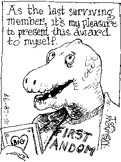We had met at Miss Cullen's, he said, describing an outfit I'd worn circa 1960, but I first remember Joe from a quarter century back when he came to a WSFA meeting at my house in Virginia. Sitting in the president's chair, I watched Joe make his entrance, this bearded guy with an imposing physical presence and a great laugh. He was not only smart, but erudite, not only funny but witty, not only charming but charismatic. AND he turned out to be an enormously hard worker.