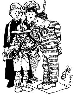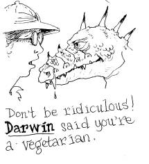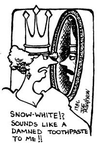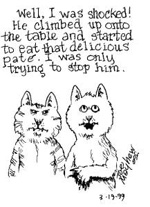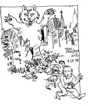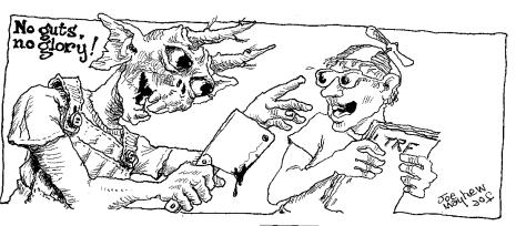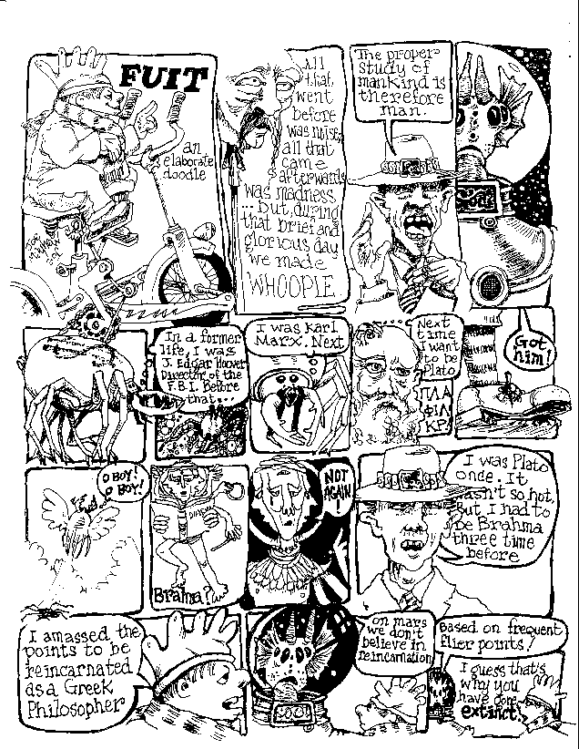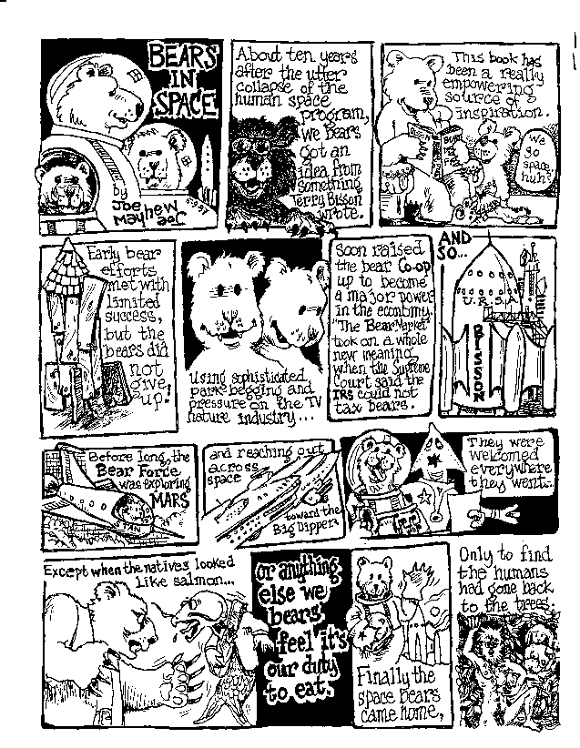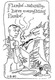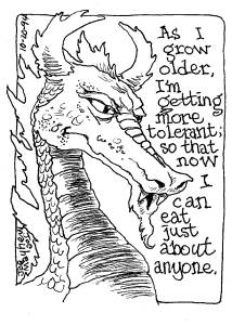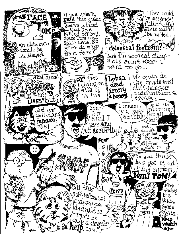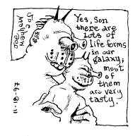 Since he went everywhere and knew everybody, Joe was fount of marvelous stories, but he was also enormously well read, and widely informed about nearly everything. Touching on philosophy he once told me I was a Taoist, and when I looked it up, damned if he wasn't right. We did amateur theatrics, I in his "Trollogy" he in my "Star Wars Roots." (His brother, Bill, said the difference was that in my play he trod the boards as the young Obi Juan Kenobi, while in Joe's play he got to be a hare-lipped chicken.) I wouldn't have known if he hadn't told me, but Joe studied my cartooning from a distance, aspiring to be an artist but deeply concerned to be his own man. Once, I rearranged the caption on one of the cartoons he showed me to make it funnier, and he laughed and said yes, that was funny, but it was Gilliland funny, not Mayhew funny. The words and idea were all his, but he didn't want to use my cadences to display his joke. The last time we discussed religion, Joe said he hoped his adherence to Catholicism would make him a better person, a little less of a thug. A lady present assured him he was a not a thug but a real gentleman. I told him: "Whatever works," and Joe grinned because I knew what he was talking about.