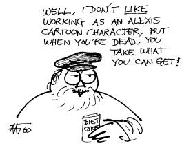 A fearful Alexis said, "This celebration of dead cartoonists has got to stop." But Bob soothed him, "We promise not to celebrate you as a dead cartoonist, just a dead author."