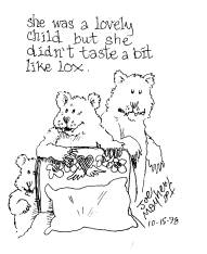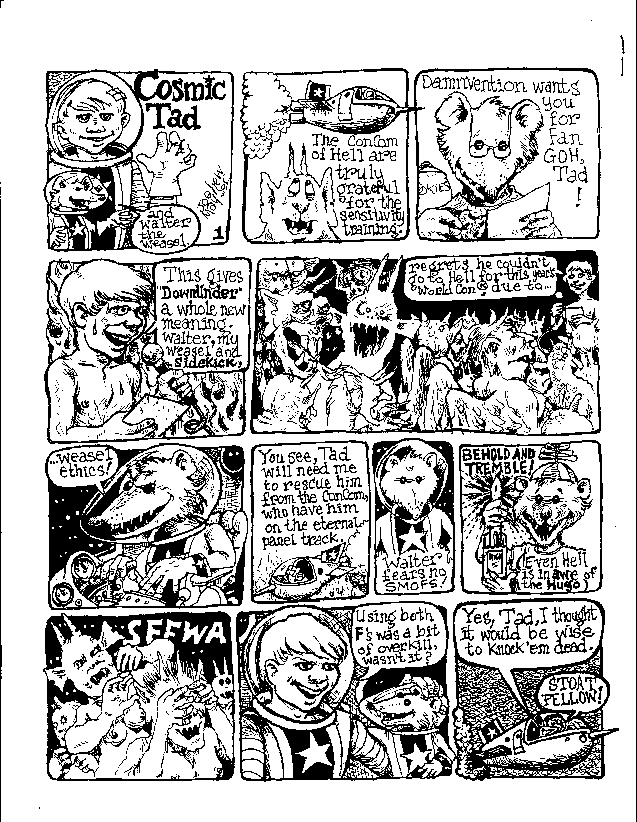Being the wallflower that I am, I really didn't get to know Joe well until I started asking him for artwork for Bucconeer's Worldcon bid ads in 1993. I had foolish volunteered to produce ads and flyers for Bucconeer that fall without any previous experience. My first ad, for one of the ConAdian (the 1994 Worldcon) progress reports, had been a crude piece using a genetic WordPerfect clipart graphic. Joe gave me a drawing he happened to have with him to use for an ad in an Intersection (1995 Worldcon) progress report. After that, Joe produced dozens of pirate drawings -- some I had suggested, but most from his own weird imagination. Like the Pie-rats, Bucky the Crabcake, and his "elaborate doodles" for the back covers of our progress reports.