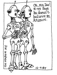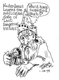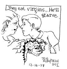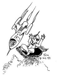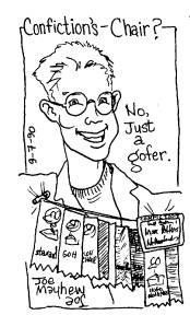 Joe Mayhew, long-time fan and for many the heart at the center of the Washington Science Fiction Association, passed away at 9 a.m. on June 10th, 2000. Joe was an active science fiction fan all of his life. In 1998 he won the Hugo award for Best Fan Artist, and was also nominated in 1990, 1996, 1997, 1999, and 2000. His cartoons have appeared in Asimov's, Analog, Pirate Writings, and numerous fanzines. As the Library of Congress' Recommending Officer for Science Fiction, Joe decided what science fiction books were worth preserving. In his last years, Joe became a professional science fiction author with stories appearing in Tomorrow, Aberrations and Aboriginal SF. He also reviewed science fiction books for the Washington Post, Absolute Magnitude, and TV's Fast Forward.
