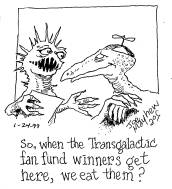Lee G. asked for help from WSFA's computer people who met after the meeting to solve her problems." Mike said that he's doing the Hugo ballots and is working on a form of online voting. Steve said that Maryland Public TV is showing the Lathe of Heaven. Richard returns from his trip to Eastern Europe. Sam Pierce said, "If you submit a review to the WSFA Journal, you may get weird feedback. I wrote a review of Catherine Asario's new book and I got a response from Asario." Steve said, the best review of the Battlefield Earth movie is that it's Travolting. Meeting unanimously adjourned at 9:51.